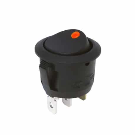 High quality illuminated round rocker switch from leading manufacturer SCI to fit the standard 20mm panel cut out. On Off, single pole single throw (SPST) function. This round rocker switch has a black body and black rocker with an amber illuminated point of light lens. This is a low voltage rocker switch and operates at 12 volts only. Carries ENEC (European) and UL (American) approvals at mains voltages and complies with RoHS.
