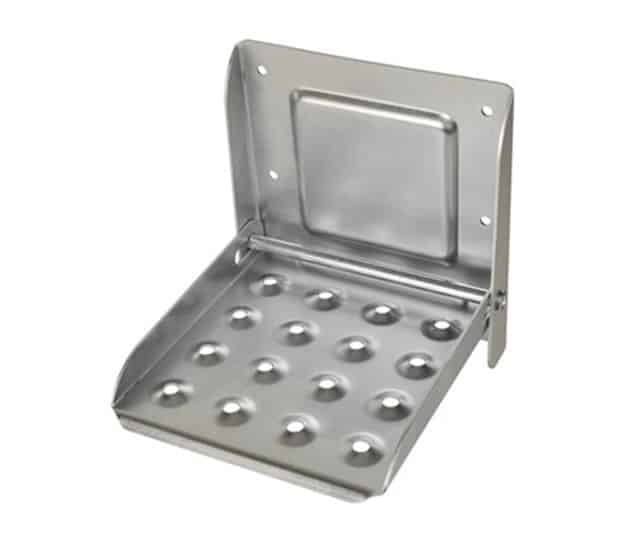 A large square, zinc plated steel, folding access step with 16 x pressed grip pads.